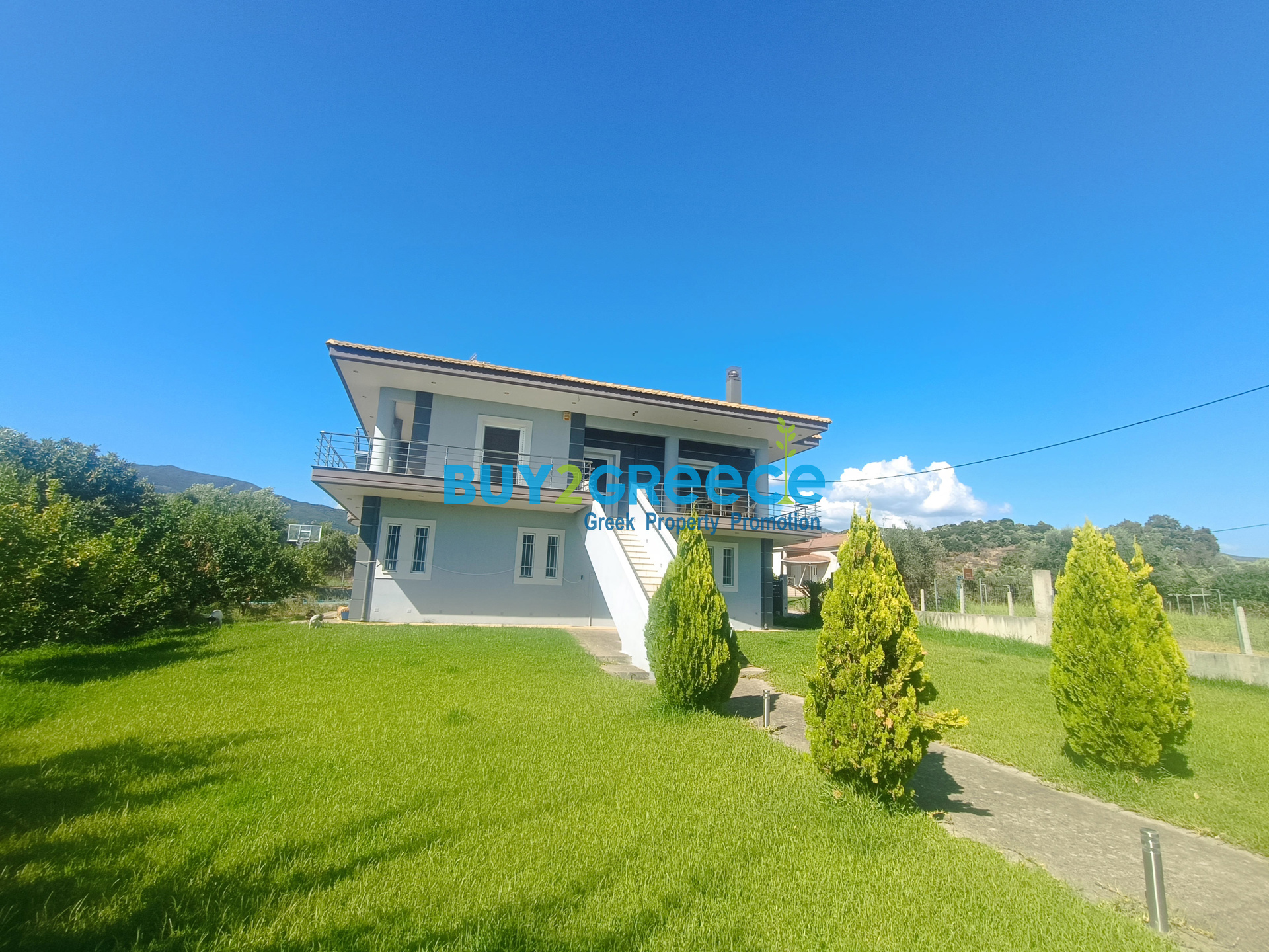 The lush garden includes a lawn, automatic irrigation system, an olive grove with 20 trees, and a basketball court – a perfect sanctuary for relaxation and recreation.